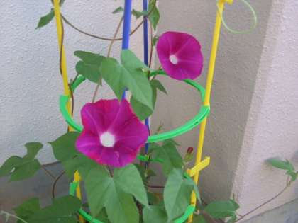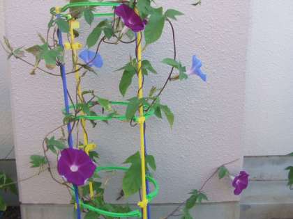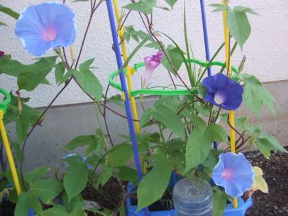 1年生が世話を続けている「あさがお」が、次から次に花を咲かせています。今、水色・紫やピンクの素敵な色がいっぱいです。