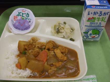 2学期の給食が始まりました。献立は「チキンカレーライス(米粉)、野菜のピクルス、ぶどうゼリー、牛乳」でした。チキンカレーライスは、米粉のカレールウを使ったカレーで、小麦アレルギーの児童も食べられるようにと考えられた献立です。甘味があり、小麦粉よりさらっとした出来上がりです。