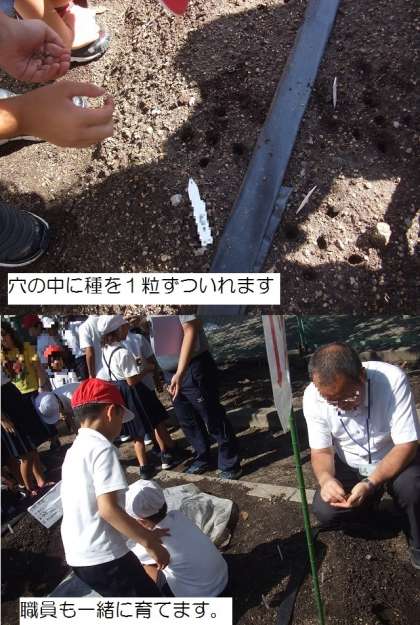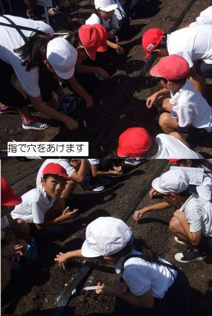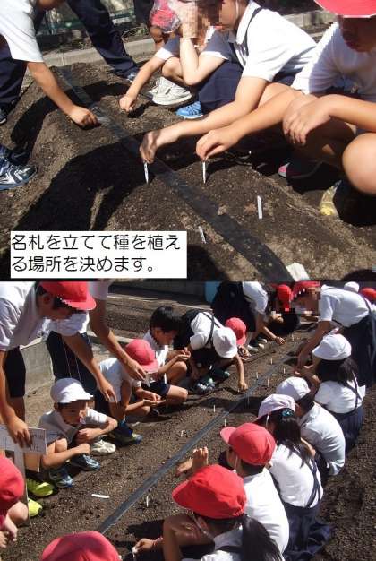 なにわの伝統野菜「田辺大根」の栽培活動が始まりました。全校児童が一人1本ずつ「田辺大根」の種を植えました。田辺大根サポーターの方に教えていただいた6年のリーダーが、班のみんなにていねいに教えていました。みんな種と種との間隔を、自分の指を広げてはかって目印をたてました。そして、その目印を中心に5粒ずつ種をうえました。