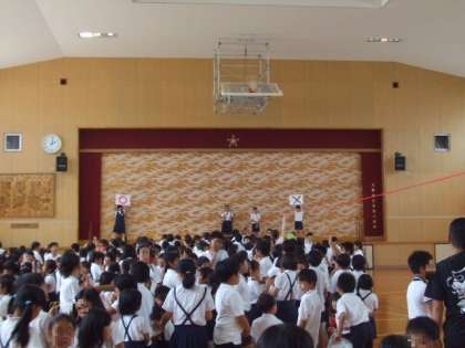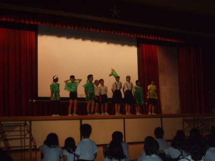 今日のふれあいタイムは、エダマメの収穫でした。今年は、児童会を中心に、計画・準備を進め「エダマメ収穫祭」という催しをしました。講堂へみんな集まり、劇・クイズを楽しんだ後に収穫します。劇には、エダマメマンが登場し、抜き方や食べ方をみんなに教えてくれました。「みんなで育てたエダマメやで〜」と素敵な言葉をかける班長もいました。きっとおいしく育っていることと思います‼エダマメの成長と共に、子どもたちの成長も感じられました。