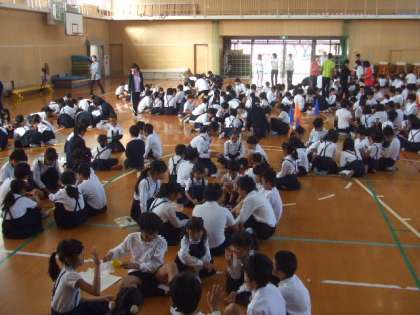 17日(水)の児童集会で、ふれあい班ごとに鶴を折りました。来週の23日・24日に6年生が「ヒロシマ」の修学旅行に持っていく千羽鶴にします。最初に6年生の代表が「ヒロシマにみんなの作った千羽鶴を持っていきます。一緒に作ってください。」と全員に伝えました。