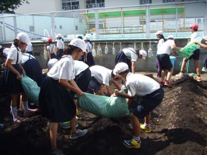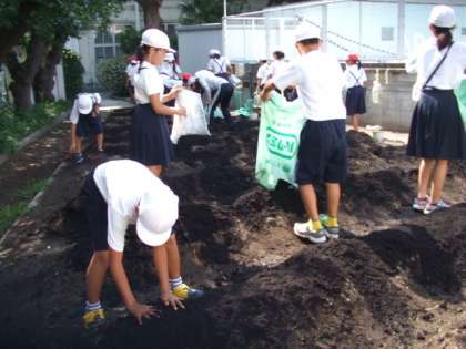 6年生が2学期の田辺大根作りに向けて農園の整備と土づくりをしました。まず、班のプレートを抜いて、雑草を抜きました。次に、腐葉土と堆肥を協力して班の畝に均等になるようにひろげました。朝から日差しがきつかったですが、さすが6年生で手際よく短時間で活動をすすめていました。田辺大根の種を植えるのはまだまだ先ですが、今から少しずつ準備がすすめられています。