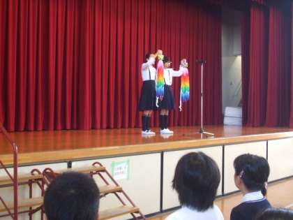 今日の児童朝会で、千羽鶴を持ちながら6年生からお礼の言葉がありました。「みんながこの前の集会で折ってくれた鶴で千羽鶴ができました。ありがとうございました。」