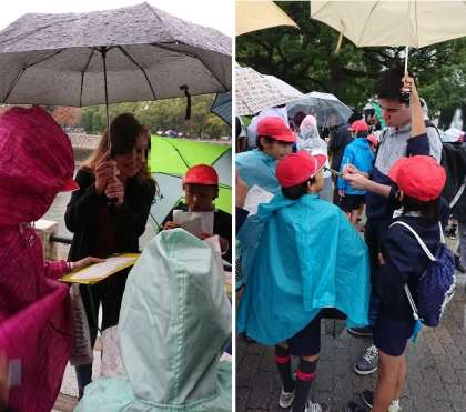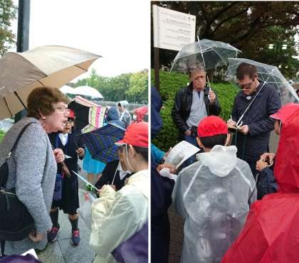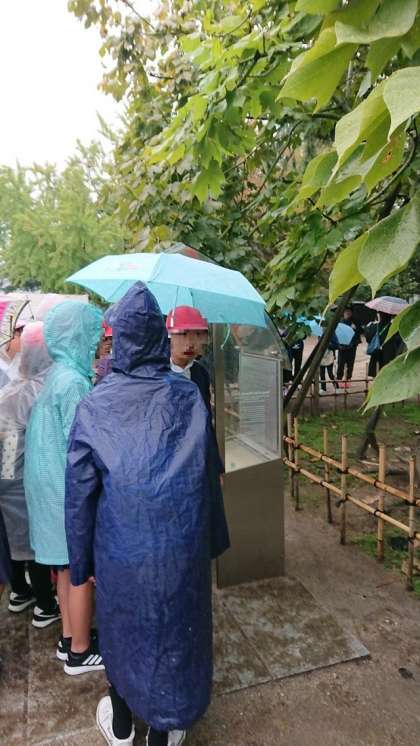 残念ながら雨の中のフィールドワークです。被爆したあおぎり、戦没者慰霊碑など見学しました。雨の中外国人のかたにもピースメッセージを書いてもらったり少し英語で会話をしたりしました。オランダから来られた方もおられました。