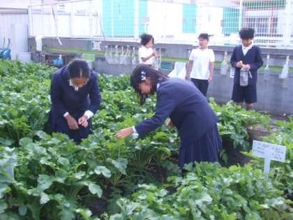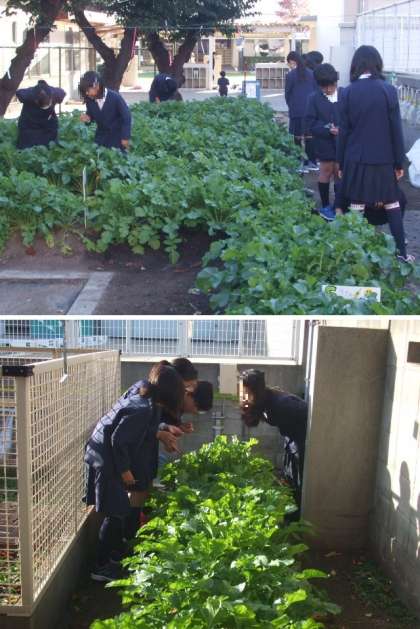 ふれあい農園のお世話は、各学年の担当曜日が決まっています。その日の朝、登校してきた子どもたちは農園へ行って水やりや虫とりをしています。ふれあいタイムがしばらくなかったので、1週間ぶりに農園に来て「こんなに大きくなってたんや!」「葉が高くなって自分の大根の場所が分からない!」と驚いている子どもたちもいました。