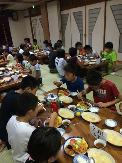 子どもたちにとって、食べることもまた楽しみの一つ。特に大自然の中での食事は格別です。おやつのすいか、そして夕食と、食欲も増しているようです。