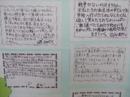 11月の職員室前の掲示は6年生です。6年生は、先週に広島方面へ修学旅行に行ってきました。そのまとめとして、一人一人の思いをメッセージにしました。それを「私の平和宣言」として掲示しました。