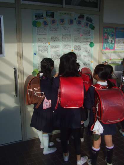 朝、登校してきた子どもたちは、知っている6年生の人のメッセージを探して読んでいました。