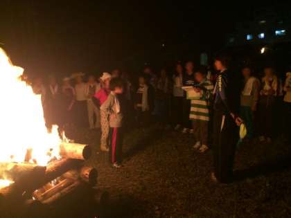林間学習のメインイベントの一つ、キャンプファイヤー。大阪は突然の雨にみまわれましたが、こちらは天候にも恵まれ、無事行うことができました。いつものように火の神が登場し点火されると一気に盛り上がりました。一つの火をみつめ、5年生が一体となるひとときです。
