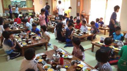 朝の集いで自然いっぱいの中気持ちよくあいさつ。体操もして軽く身体を動かしたあとの朝食はこれまたおいしい!