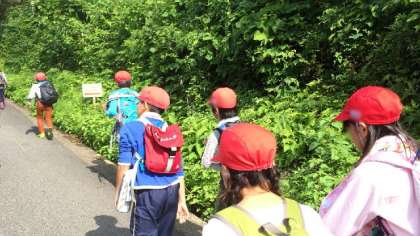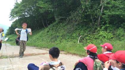 林間2日目の午前は山登りです。これがまた結構きついのですが、山の中腹での休憩時も5年生のみんなには笑顔!なんでも楽しむ5年生です。