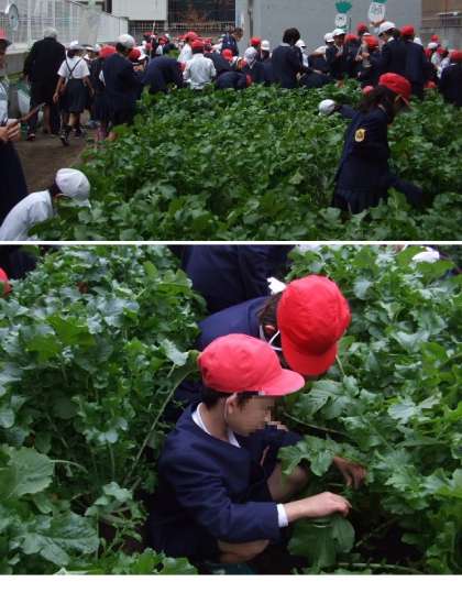 ふれあい清掃が早く終わった班は、ふれあい農園のお世話をしました。今のところ昨年に比べて大根が大きくなっているような気がします。しかし、アブラムシがたくさん発生してしまいました。みんな、葉の裏や根元の方までしっかりと調べて取り除いていました。