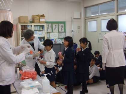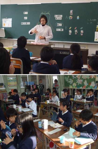 毎年4年生で「歯の大切さ、むし歯の原因、歯みがき、フッ化物など」についての学習をします。はじめはクラスで、むし歯になるしくみを教えていただきました。おやつのダラダラ食べ、ジュースの飲み過ぎはむし歯(歯垢)になりやすいことなど、歯についていろいろなことを教えていただきました。