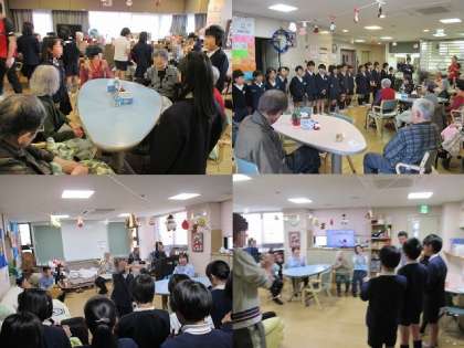 クラス全員で歌やリコーダーの演奏をしました。「もみじ」の歌をとても大きな声で一緒に歌ってくださいました。高齢者の方の中には、涙を流しながら喜んでいただいた方もおられました。
