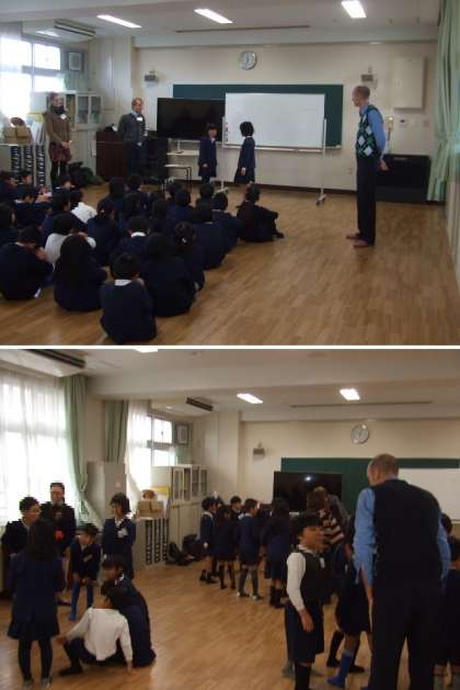 2年生が、ネイティブ講師の先生に来ていただいて英語の学習をしました。「What’s your name?」「How are you?」などの表現を教えていただいてから、3グループに分かれてできるだけたくさんの人と話をする活動をしました。みんな次々と新しい友だちを見つけて話をしていました。