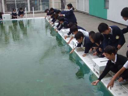 今日は、今シーズンで一番の冷え込みだったようで、プールの水が凍っていました。生活科の「冬を楽しもう」の学習で、1年生がプールサイドに行ってはまらないようにそっと近づいて氷を触っていました。みんな大喜びの様子でした。中には割れた氷を持って教室に持って帰る人もいました。