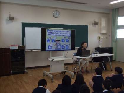 スマホ・携帯は大変便利である反面、個人情報が流出したり、トラブルにまきこまれたりする危険性もあること等を学習しました。子どもたちは興味津々にお話を聞いていました。