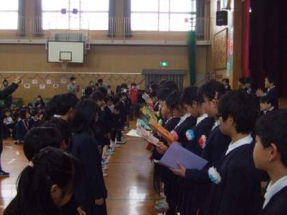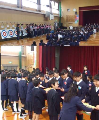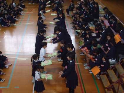 プレゼント交換では、在校生からは「ふれあいタイム」の時間に作ったメッセージカードを班長さんに渡しました。もらった6年生は、すぐにどんなことが書いてあるか嬉しそうな顔で見ていました。6年生からメッセージカードのお返しとして、6年生から各クラスに「ぞうきん」が渡されました。
