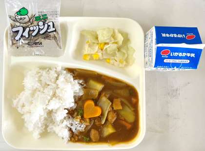 ☆今日の給食では、牛乳、鶏肉、ミニフィッシュが赤のグループの食べ物です。