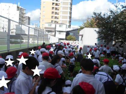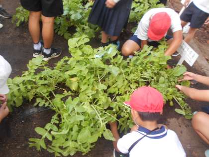 畑のグループは、大根の世話に取り組みました。雑草を抜いたり、害虫を見つけて取り除いたり、土寄せをしたりと、丁寧に作業を進めていました。大根が元気に育つように、みんなで力を合わせて頑張っていました。