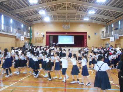 もう一方のグループは、講堂で「じゃんけん列車」を楽しみました。じゃんけんで勝った人が先頭になり、負けた人が後ろにつながっていくゲームです。列はどんどん長くなり、最後にはとても長い列ができて、みんな大喜び!笑顔いっぱいの楽しい時間となりました。
