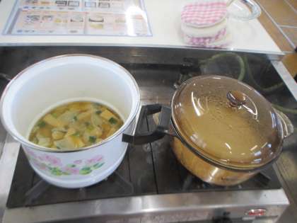 ご飯は透明な鍋を使って炊き、炊きあがる様子をみんなで観察しました。ふっくらと炊きあがったご飯に、子どもたちは感動の声をあげていました。