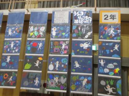 2年生は、宇宙旅行をテーマにしたカラフルな平面作品です。
