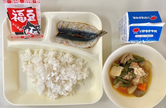 ☆給食では、節分の行事献立として「いわしのしょうがじょうゆかけ」と「いり大豆」が出ます。