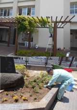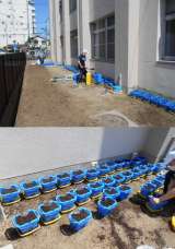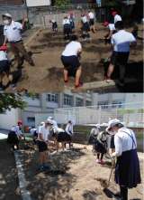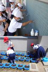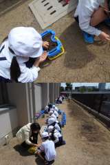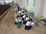 1年生がアサガオの種を植えました。ABCのグループごとに校舎の南側で鉢に植えま...