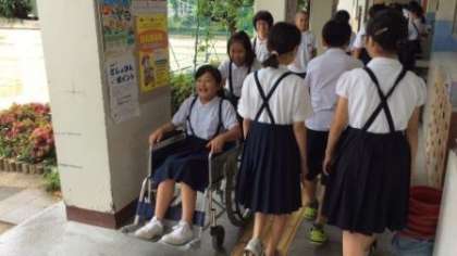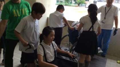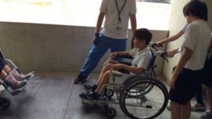 5年生が車いす体験をしました。友達を乗せて、段差や坂道を上手におすことがことができました。