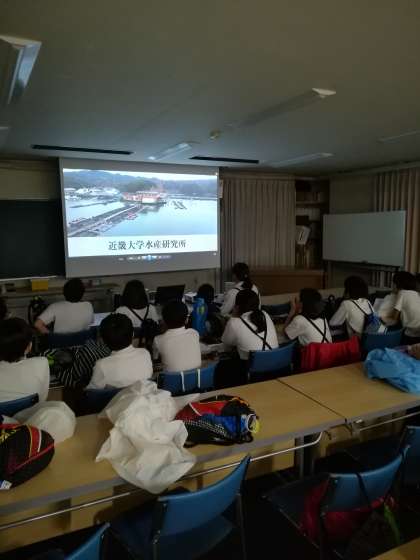 近畿大学水産研究所に着きました。4つの班に分かれて見学しています。