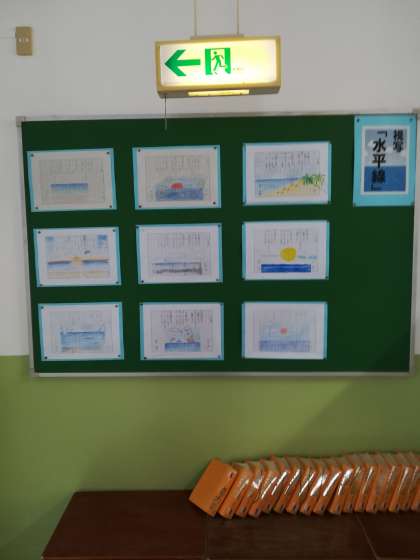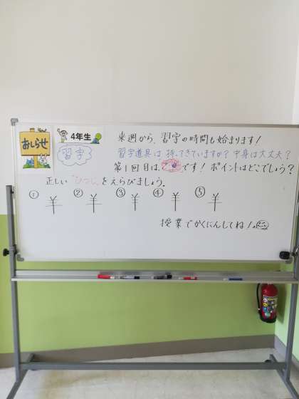 学年の掲示板には、視写の作品や学習で取り組むことのクイズなどがあります。
