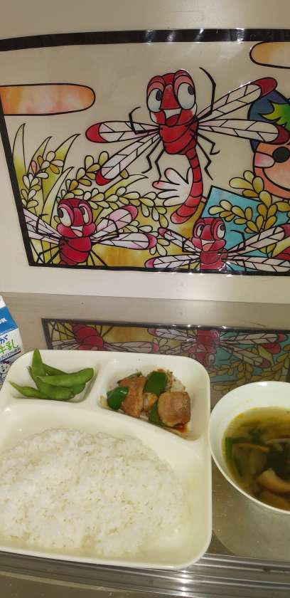 ホイコウロー 中華スープ えだまめ ごはん 牛乳
