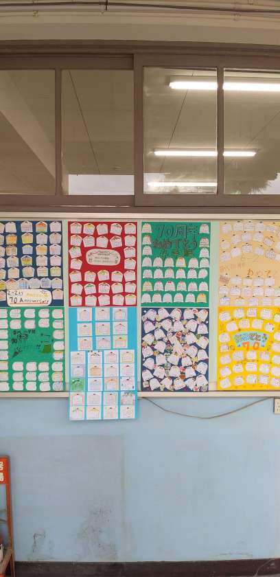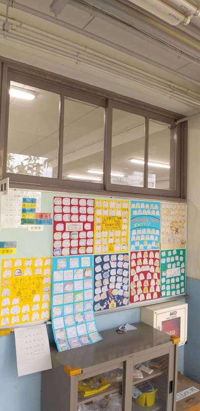 教室カーテンや運動場砂落としマット、講堂舞台幕などをきれいにしていただいたお礼や、これから自分ががんばりたいこと、どのような苗代小学校にしたいか等をメッセージカードに書いて、職員室前に掲示しています。