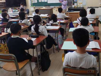 リコーダーの学習では、マスクを着用したまま練習をしております。音を出してタンギングの練習をすることができず、子どもたちは悩んでおりました。やはり実際に音を出して練習することができないと、難しいようです。みんなでリズムを合わせて演奏ができる日が楽しみです。