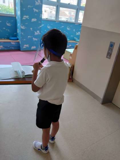 リコーダーを練習する際は、フェイスシールドを着用しています。