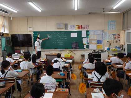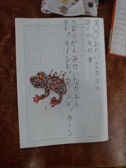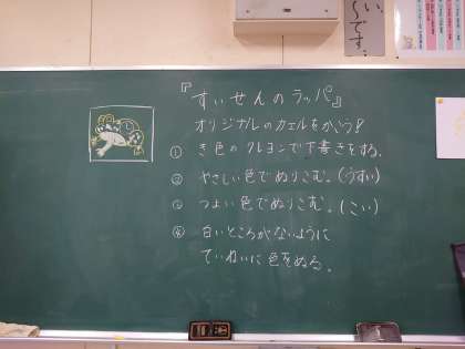 国語科で学んだ「すいせんのラッパ」を題材とし、ノートに作成した下書きをもとにしてオリジナルのカエルを描いていきます。