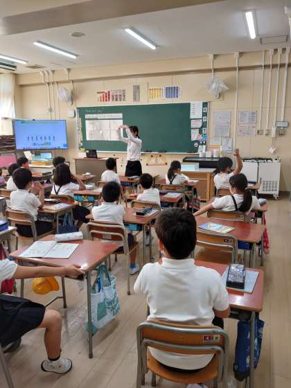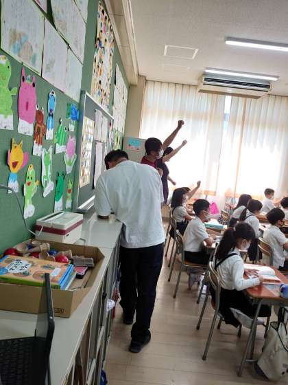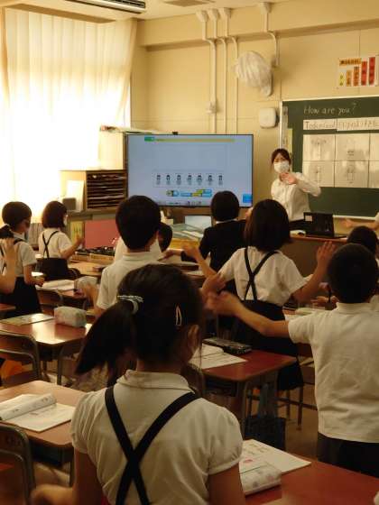 外国語の学習では、いつもの学習以上に先生もアクティブに活動をします。見学にきていた先生方もノリノリで活動をしていました。