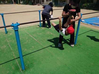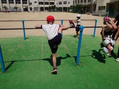 本日は天気が良く熱いため、自分が鉄棒をしていない時は日陰から見ていました。