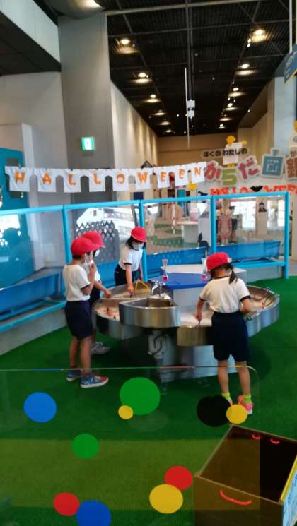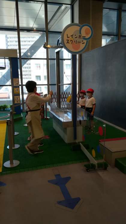 大きなシャボン玉遊びです。うまくできるかな。