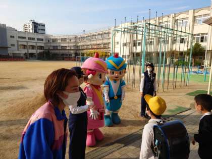 今日の下校は、大阪府警のマスコットキャラクターが「ケイちゃん」と「フーくん」がお見送りをしてくれました。