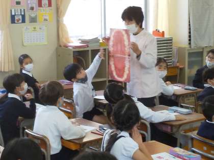歯科衛生士の方に来ていただいて、歯みがきの指導をしていただきました。虫歯のことや歯みがきの仕方について教えていただきました。
