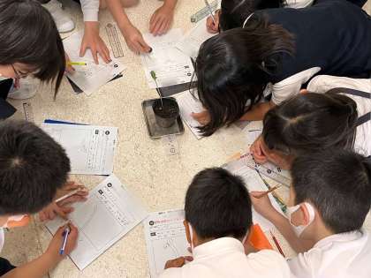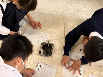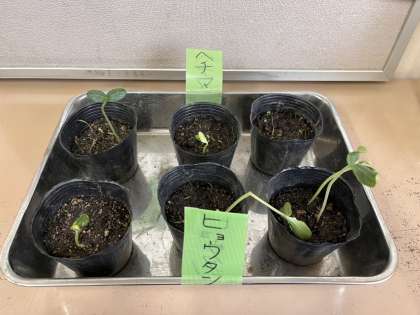 4年生の教室で育てていたヘチマとヒョウタンの芽が出ていました。