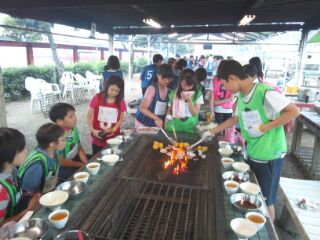 海水で濡れた身体をシャワーで流し、BBQでの夕食の準備です。センターの職員の方の協力もあり、火もいこり美味しそうな臭いが当たりに漂っています。