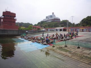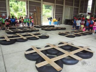 やった「〜いかだだ〜」自分で作ったいかだは、最高。天気はいいし、水は気持ちいい。今から、カラーボールを使ってゲームをするよ。どのチームが勝つのかな?
