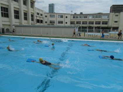 4年生は息継ぎの練習を頑張っています。息継ぎができれば25mも楽に泳ぐことができるでしょう。がんばれ〜!