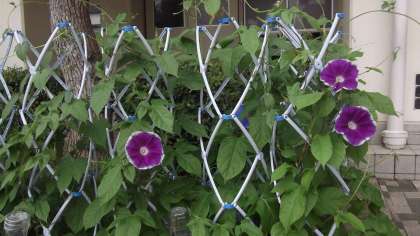 1年生の教室の前に、2年生からのプレゼントで貰った朝顔が咲き始めています。