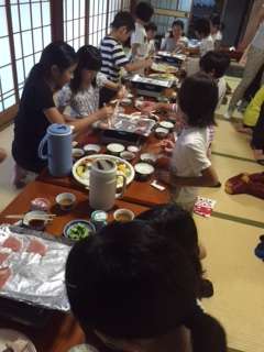 夕食です。みんなでコンロを囲んで、焼き肉です。