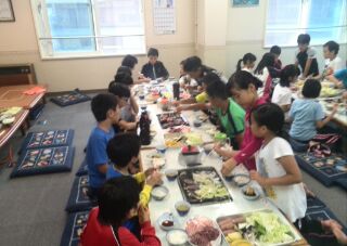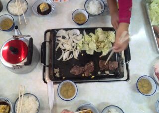夕食は焼き肉です。けっこうなボリュームがありましたが、完食していました。おひつのごはもからっぽです。