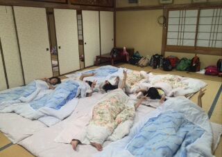 布団からはみ出て、畳の上で寝ちゃってる・・・。